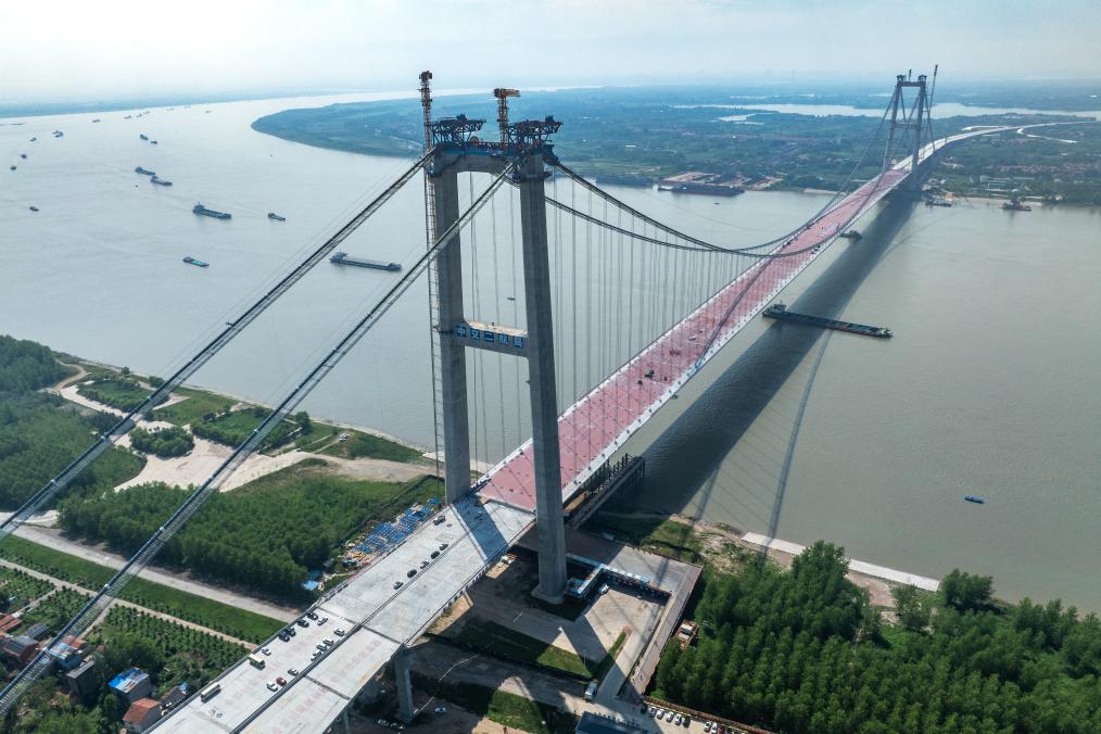 双柳长江大桥位于武汉“东大门”,具有“主塔高、跨度大、桥面宽、材料新”的特点。其中,南北主塔高度分别为212.78米和213.75米,主跨1430米,采用双向8车道标准建设,桥梁全宽50.5米。
