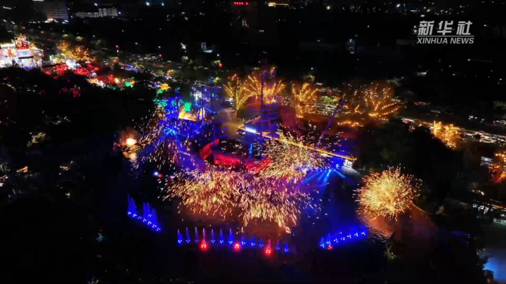 2025年7月,河南省鹤壁市浚县古城,当地文旅部门组织的民俗社火表演成为夜晚的亮点,吸引众多市民和游客前来游玩。新华社视频截图