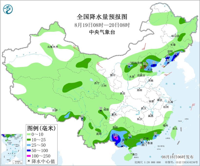 预计,8月18日08时至19日08时,广东南部和西部、广西中南部、海南岛西部以及内蒙古河套地区和东北部、陕西北部、山西北部、北京南部、天津南部、河北东部、甘肃西南部等地部分地区有大到暴雨,其中,内蒙古河套地区、广西南部沿海等地部分地区有大暴雨(100~120毫米)(见图1)。上述部分地区伴有短时强降水(最大小时降雨量20~50毫米,局地可超过70毫米),局地有雷暴大风等强对流天气。中央气象台8月18日06时继续发布暴雨蓝色预警。
