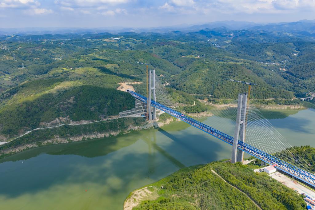 西安至十堰高速铁路汉江特大桥钢桁梁8月18日实现合龙。(受访单位供图)