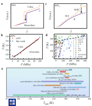 KPF6材料在室温常压下是一种面心立方结构,其内部的PF6分子团可以自由地随机旋转。当温度降低或压力增大时,它会经历两次结构变化(相变),转变为不同的单斜结构。正是这些相变过程导致了强大的吸热或放热效应。