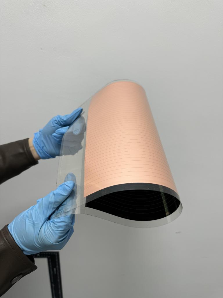 今年,校企联合团队成功将原位涂层技术转移到工业级狭缝涂布设备上,实现宽带隙钙钛矿薄膜在800多平方厘米的柔性基板上一次成型。