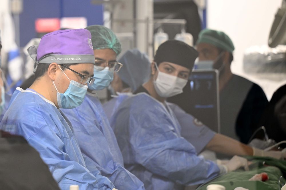 2025年1月23日,在巴基斯坦旁遮普省拉瓦尔品第市,中国医学科学院阜外医院副院长潘湘斌(左一)为一名巴基斯坦先心病儿童做手术。在两天的时间里,潘湘斌率领的援巴先天性心脏病治疗紧急项目专家组,为8名先天性心脏病患儿进行了免费手术。在巴期间,团队还为当地约200名医务人员开展了集中培训。