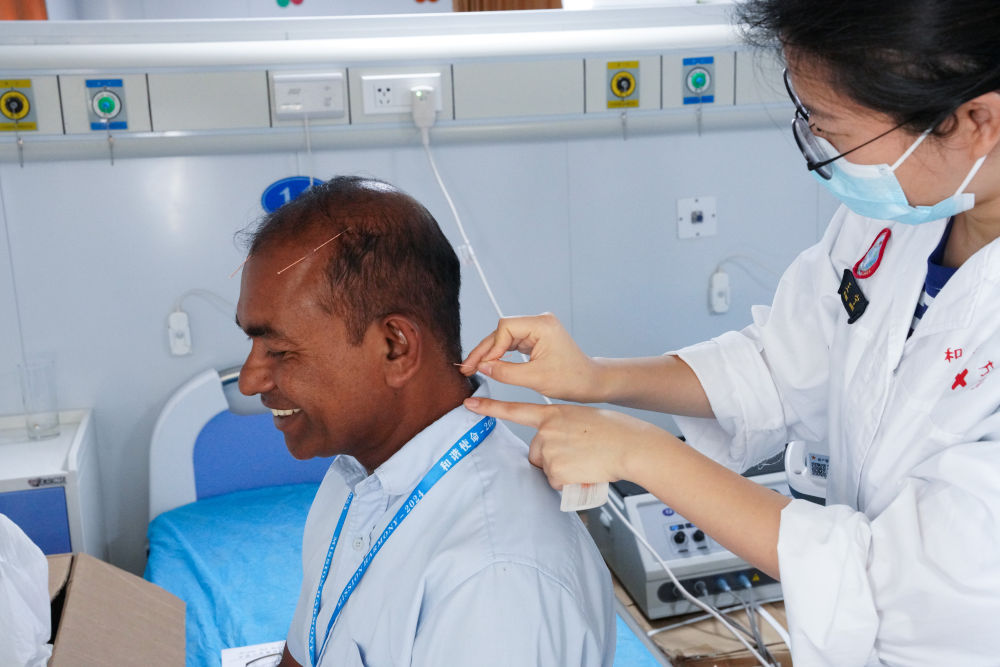 2024年12月24日,在斯里兰卡科伦坡港,中国海军“和平方舟”号医院船上的医生为当地居民做针灸治疗。2024年12月,执行“和谐使命-2024”任务的中国海军“和平方舟”号医院船停靠在科伦坡港。船上17个临床科室、5个辅助诊疗科室的100余名医护人员,可开展60余种检查治疗或手术。许多斯里兰卡民众不远千里而来,获得中国医生的诊疗救助。