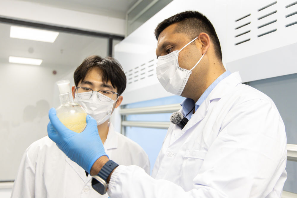 今年37岁的穆罕默德·沙巴兹来自巴基斯坦,目前在国内一家核医疗科研企业,从事精准放射治疗技术的研究推广工作。2006年,沙巴兹从巴基斯坦来到中国学医,至今已在中国生活了近20年。在中国工作期间,沙巴兹搭建平台帮助巴基斯坦学生来华求学,同时也邀请中国专家到巴基斯坦进行指导,为推动中巴在医学教育、科研及数字医疗等领域合作贡献着青年力量。这是2025年7月29日,沙巴兹(右)与同事在实验室内交流。
