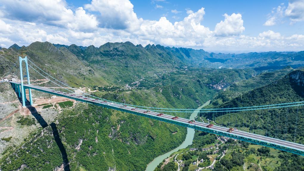 花江峡谷大桥全长2890米,桥面距水面625米,高度居世界第一,主桥跨径1420米居山区桥梁跨径世界第一,即将于9月下旬投入使用。