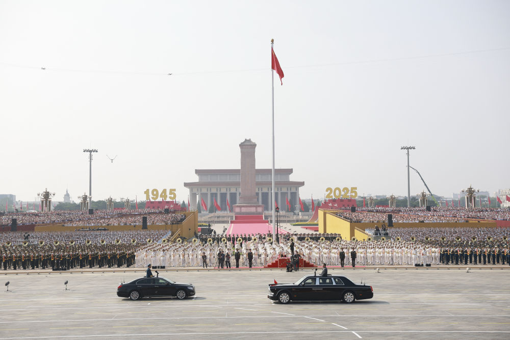9月3日,纪念中国人民抗日战争暨世界反法西斯战争胜利80周年大会在北京天安门广场隆重举行。中共中央总书记、国家主席、中央军委主席习近平发表重要讲话并检阅受阅部队。这是习近平乘检阅车,经过金水桥,驶上长安街。新华社记者 刘卫兵 摄