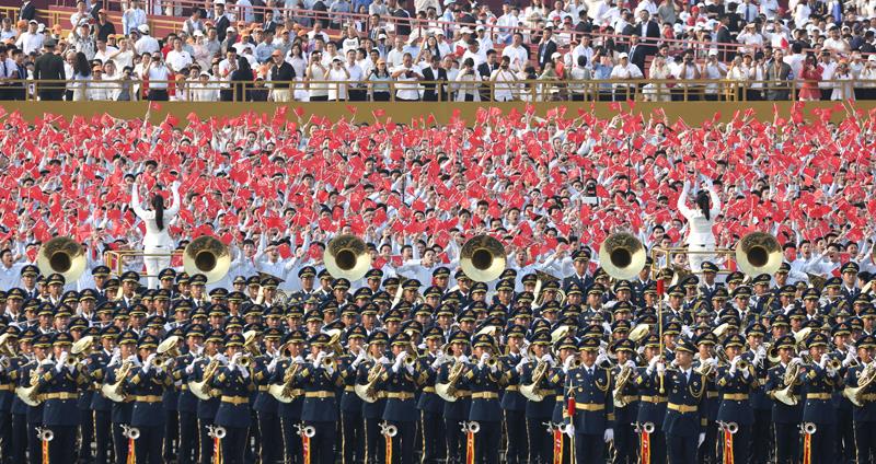 纪念大会开始前,天安门广场上,千人联合军乐团演奏四首歌曲,合唱团唱响《松花江上》《在太行山上》《保卫黄河》《没有共产党就没有新中国》。