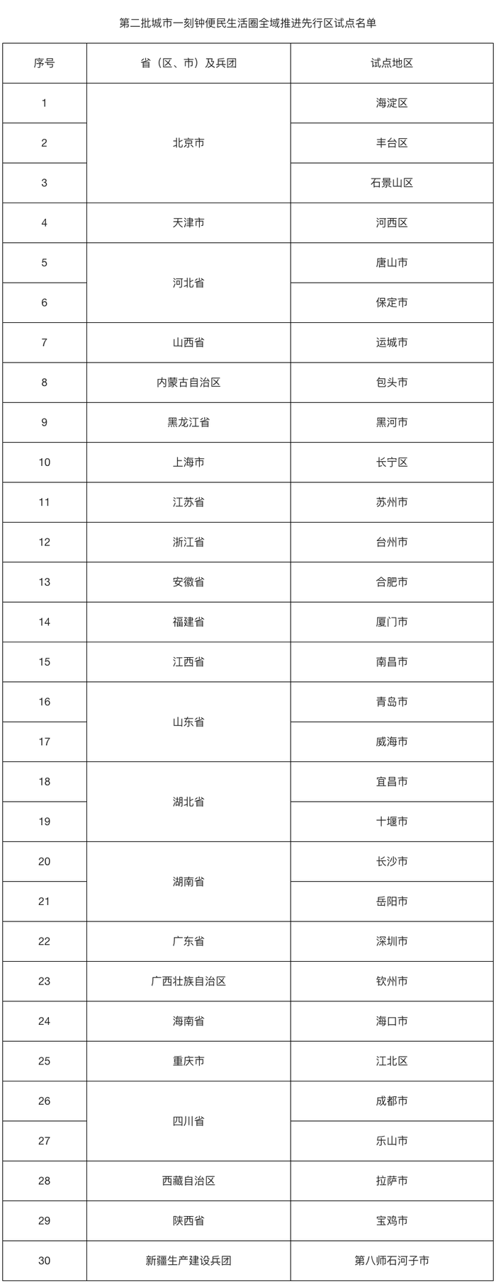为全面推动城市一刻钟便民生活圈建设,着力惠民生、促消费,根据《商务部等11部门办公厅(室)关于推广全国第二批城市一刻钟便民生活圈试点经验及开展第二批全域推进先行区试点申报工作的通知》(商办流通函〔2025〕273号)要求,在各地申报的基础上,经专家评审并向社会公示,商务部等部门确定了第二批城市一刻钟便民生活圈全域推进先行区试点地区30个,现予公布,并将有关事项通知如下: