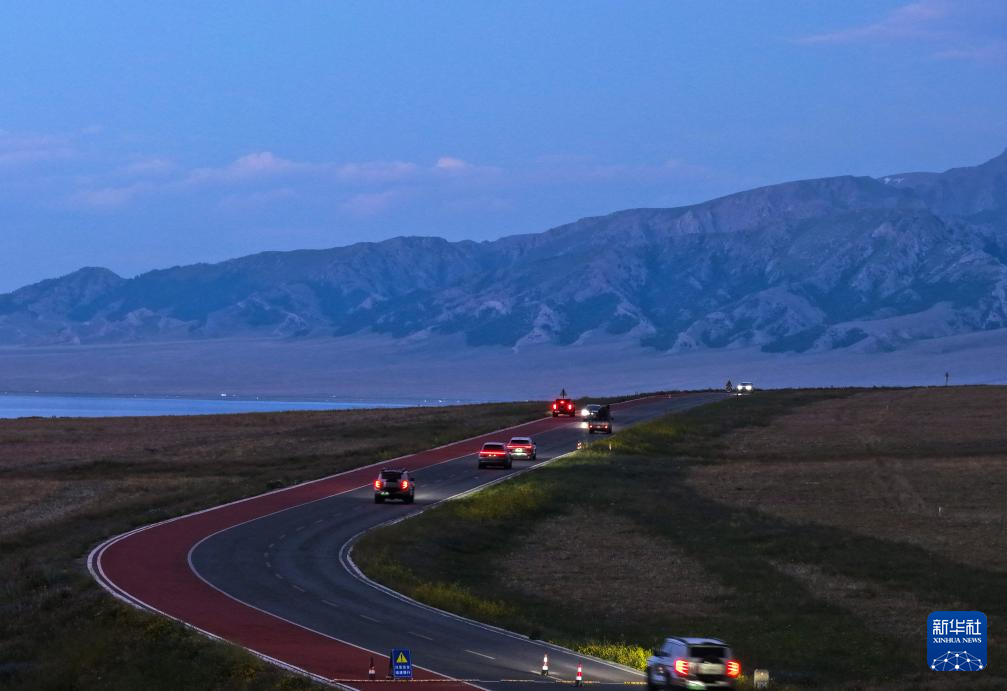 游客驾车行驶在赛里木湖景区(无人机照片,7月8日摄)。