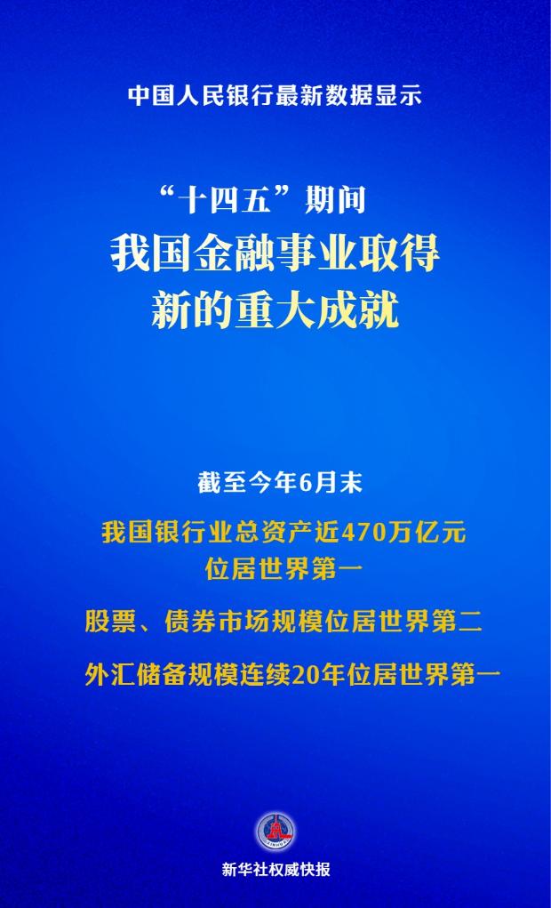 中国人民银行行长潘功胜9月22日在国新办举行的“高质量完成‘十四五’规划”系列主题新闻发布会上介绍,“十四五”期间,我国金融事业取得新的重大成就。截至今年6月末,我国银行业总资产近470万亿元,位居世界第一;股票、债券市场规模位居世界第二;外汇储备规模连续20年位居世界第一。