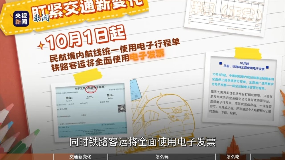 10月1日起,民航境内航线告别纸质行程单,统一使用电子行程单,同时铁路客运将全面使用电子发票。如果老年人、无法使用网络的人群不方便查询座位和车次信息,可以到车站人工窗口、自助设备打印行程信息提示单。