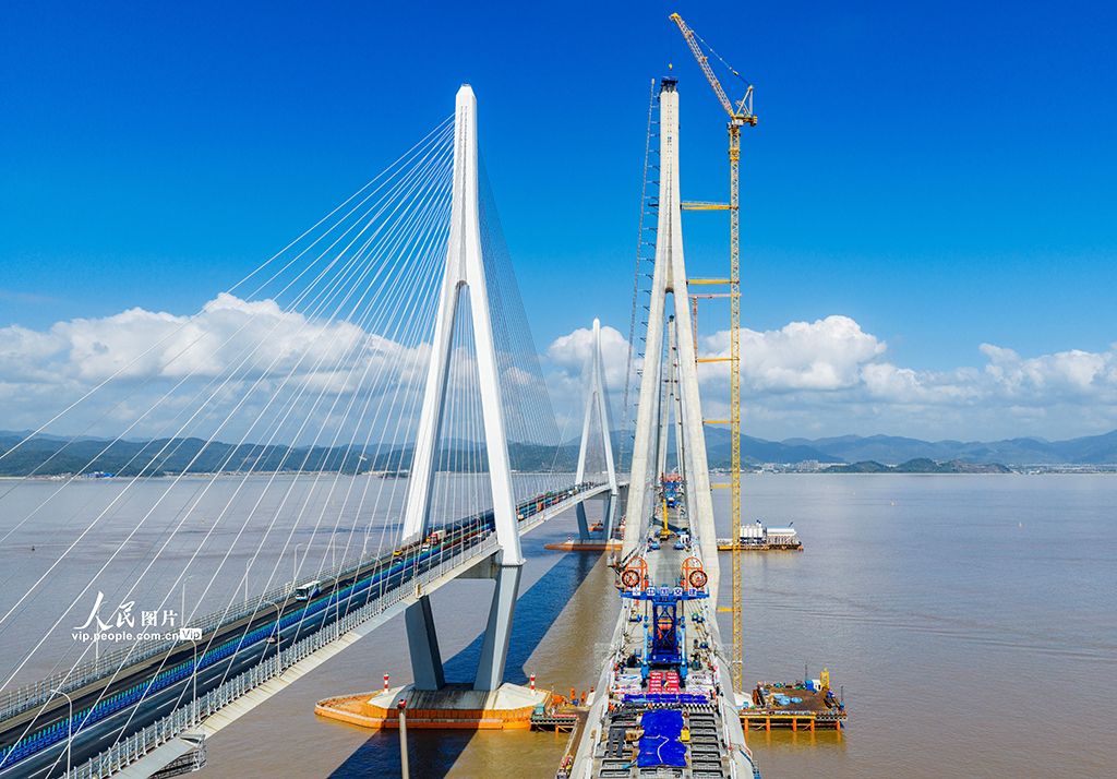2025年10月10日,浙江宁波市域铁路象山港跨海大桥南侧边跨顺利合龙。沈颖俊摄(人民图片网)