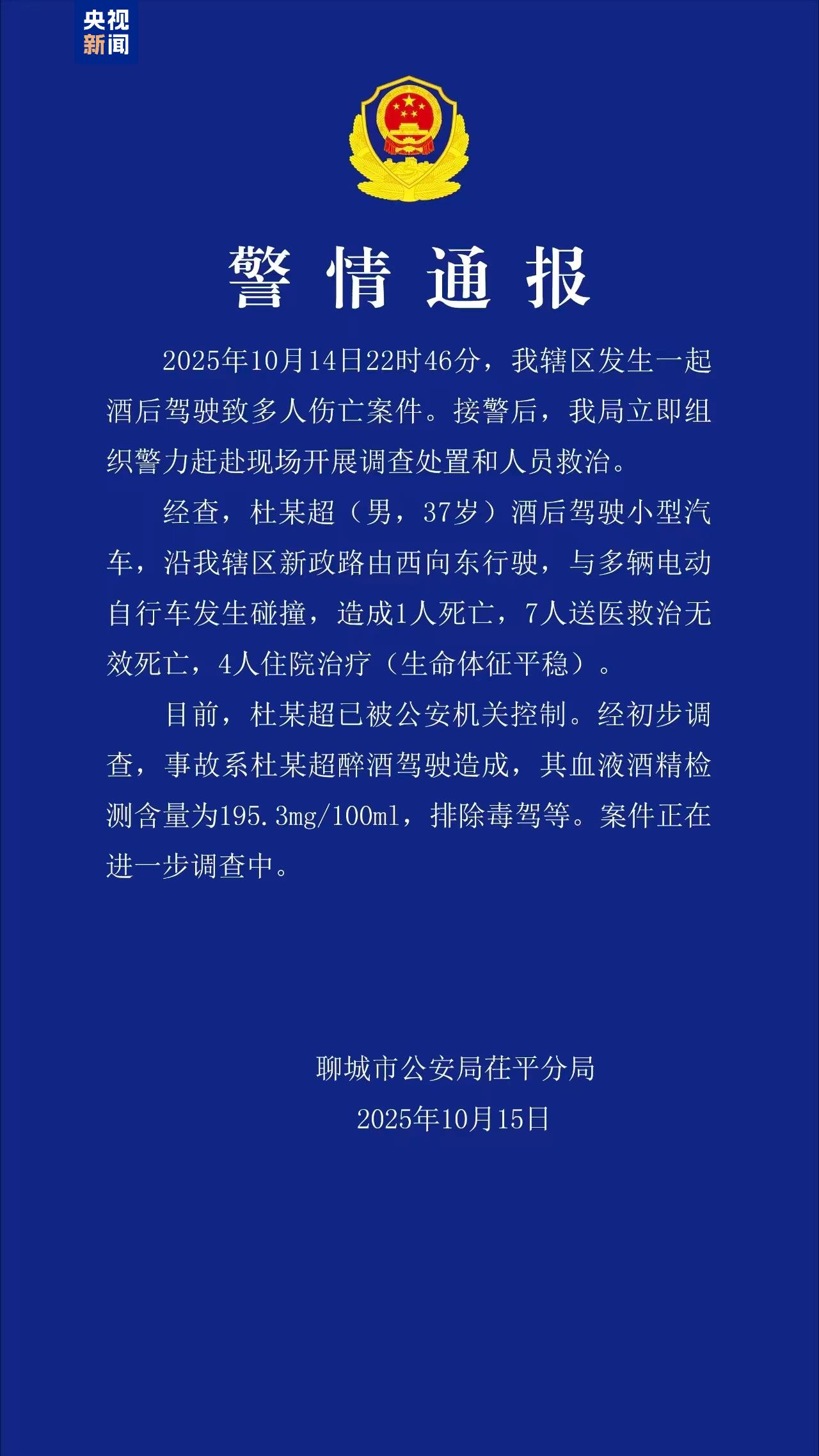今天,山东聊城公安局茌平分局发布警情通报:10月14日22时46分,辖区发生一起酒后驾驶致多人伤亡案件。经查,杜某超(男,37岁)酒后驾驶小型汽车,沿辖区新政路由西向东行驶,与多辆电动自行车发生碰撞,造成1人死亡,7人送医救治无效死亡,4人住院治疗(生命体征平稳)。