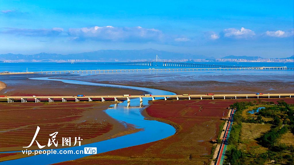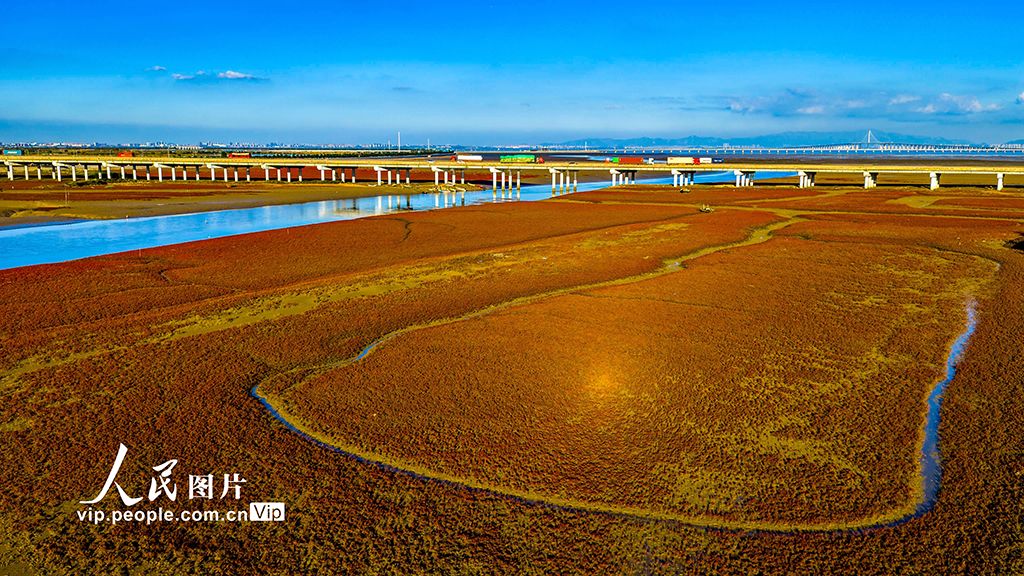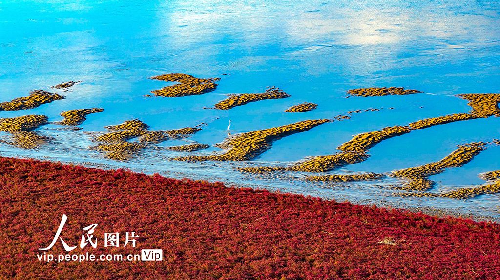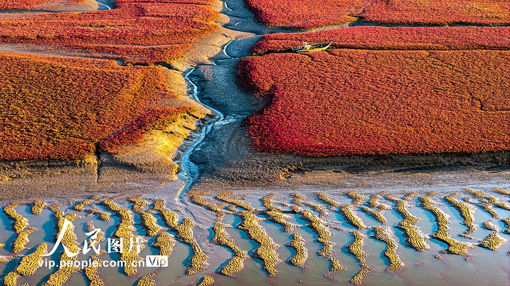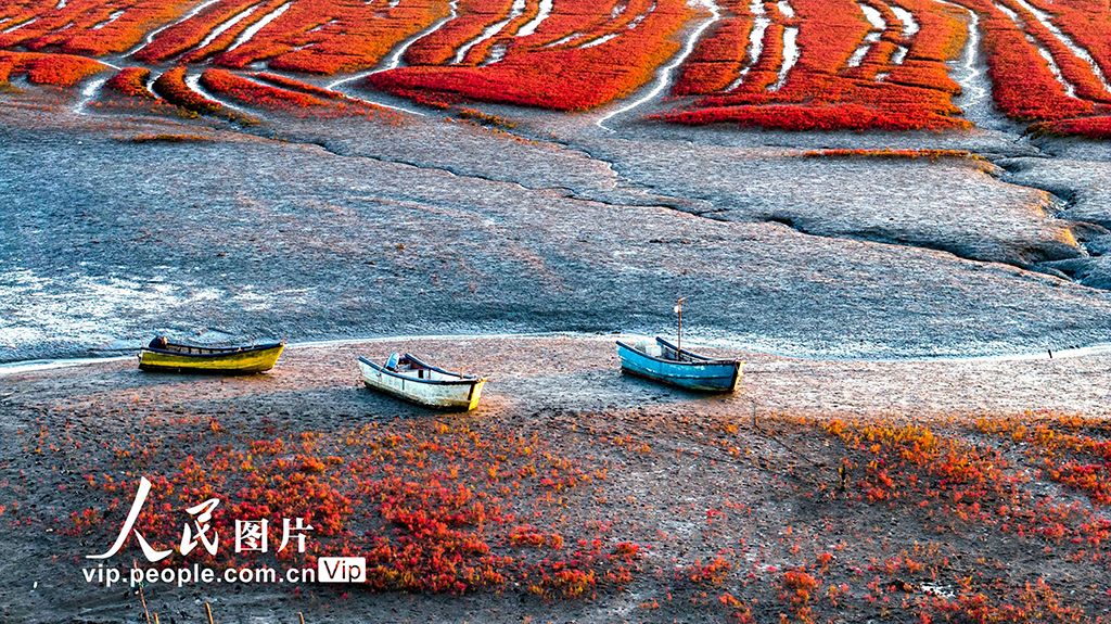 2025年10月14日,山东青岛西海岸新区红石崖街道河海湿地,盐地碱蓬织就的红海滩绚丽多彩,美不胜收。韩加君摄(人民图片网)