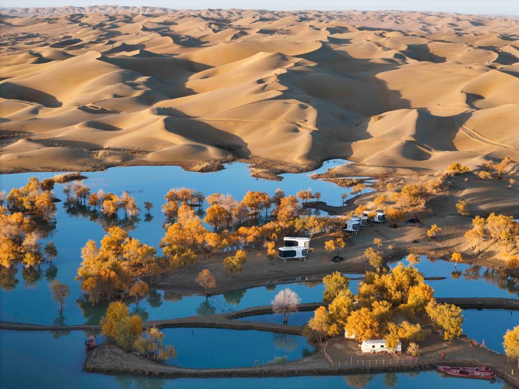 2024年10月13日拍摄的内蒙古阿拉善盟额济纳旗大漠胡杨林景区。 新华社记者 贝赫 摄