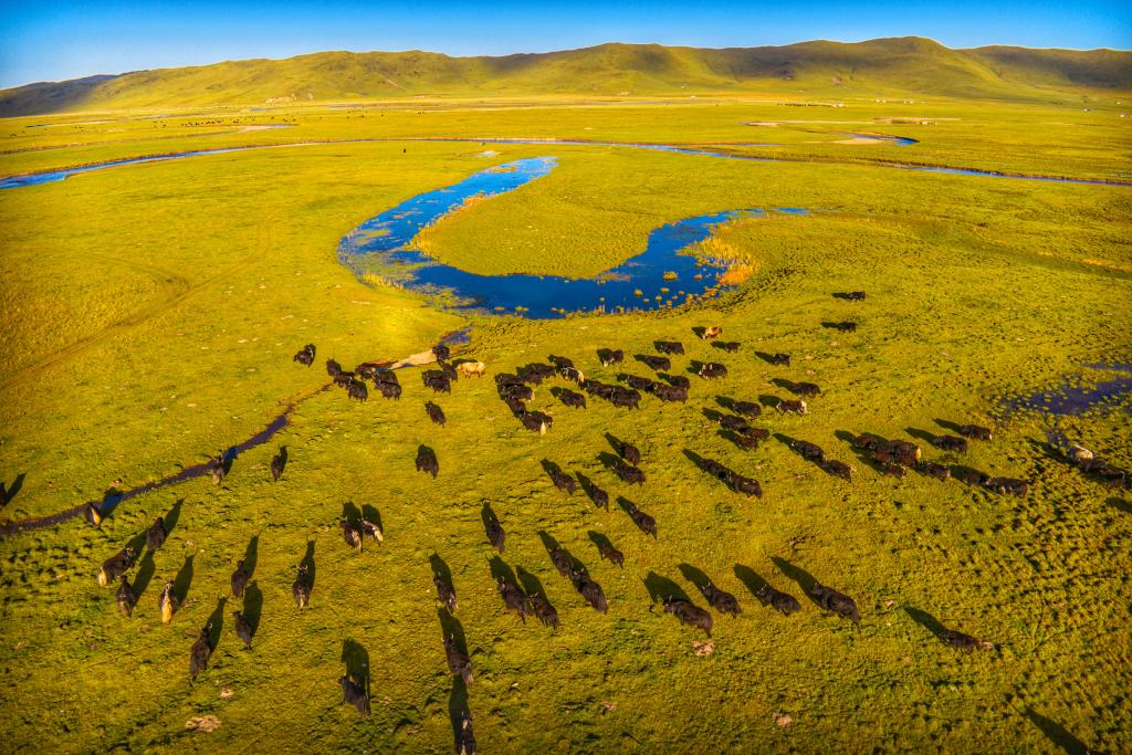 2025年9月13日,在四川阿坝县,牧民赶着牛群牧归。新华社发(米林摄)