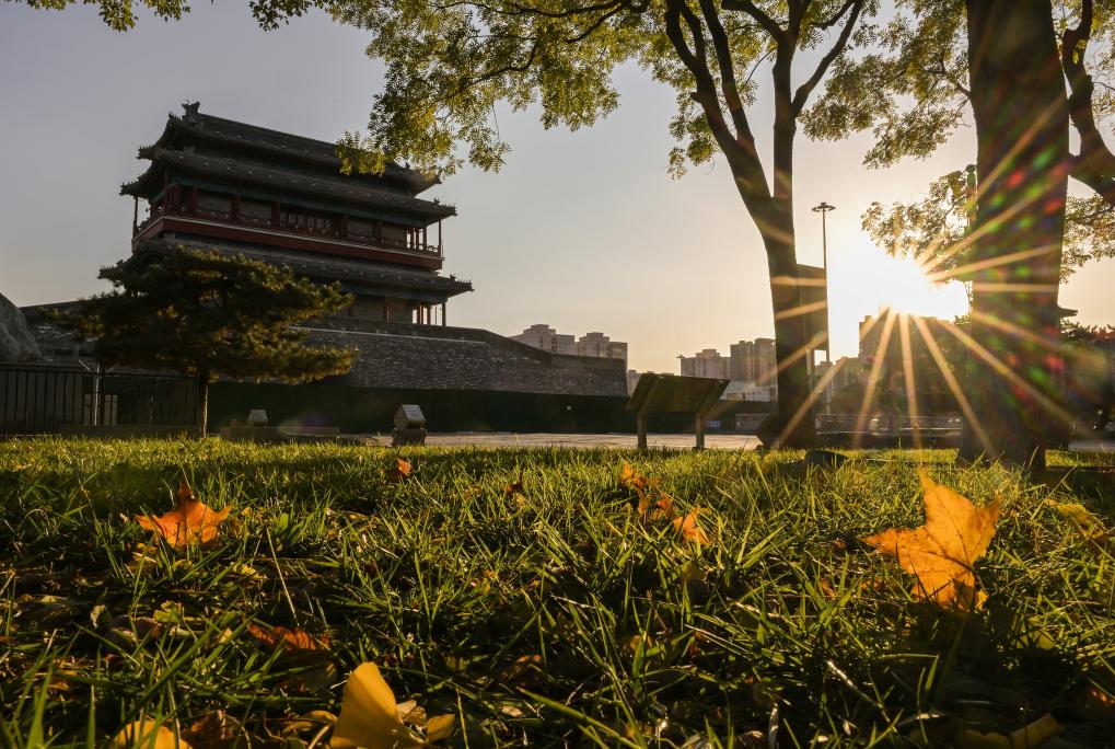 2023年11月6日,秋日北京,天高云淡。北京中轴线最南端的永定门,文物建筑与色彩斑斓的秋叶相互映衬,美不胜收。新华社记者 李贺 摄