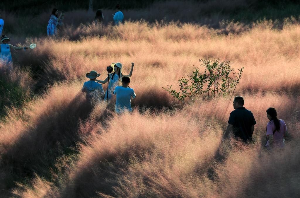 2025年10月2日,游客在浙江省台州市温岭植物园粉黛乱子草花海中赏景拍照。新华社发(周学军 摄)