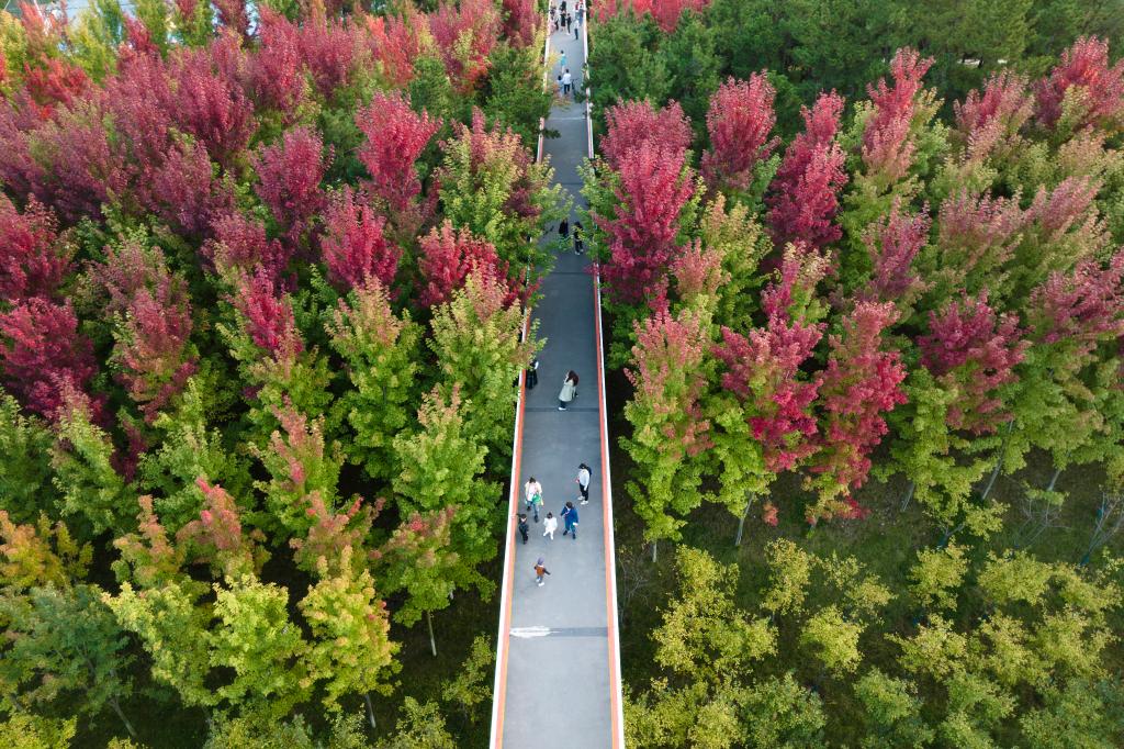 2023年10月7日,市民在陕西西安雁南公园内驻足观景。新华社记者 邵瑞 摄