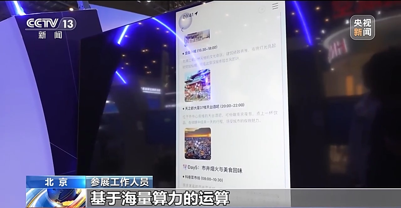 参展工作人员:您好,我想去南京。您可以看,包括美龄宫、总统府,还包括玩的、吃的,基于海量算力的运算,它可以非常快速为您出一个非常详尽的方案。