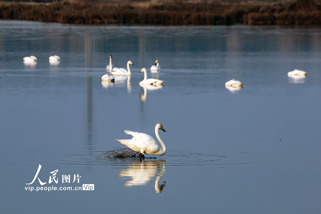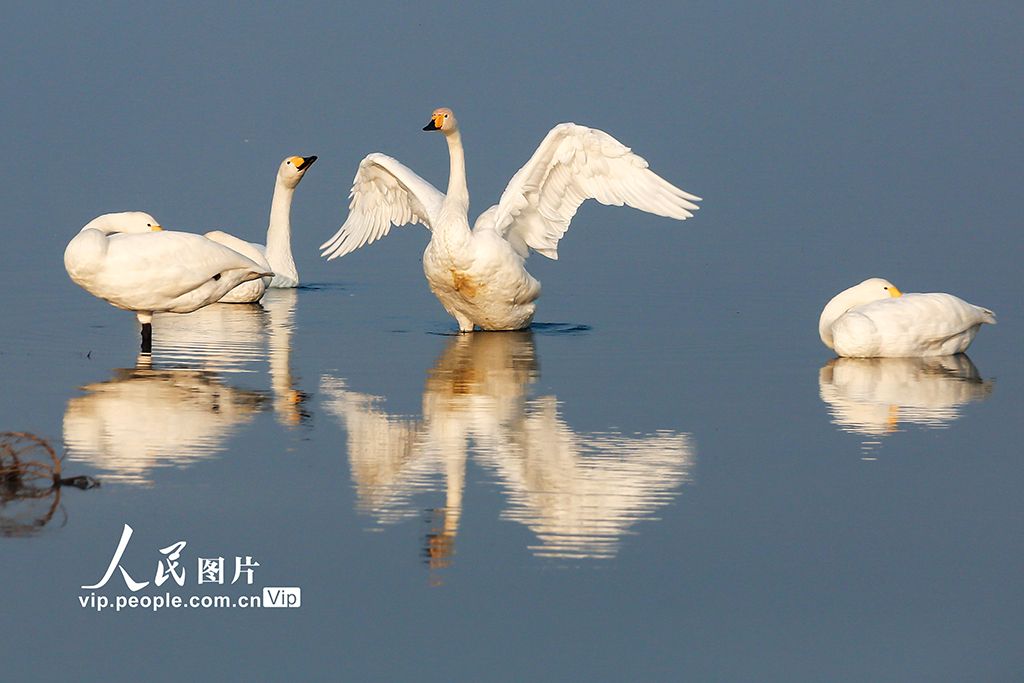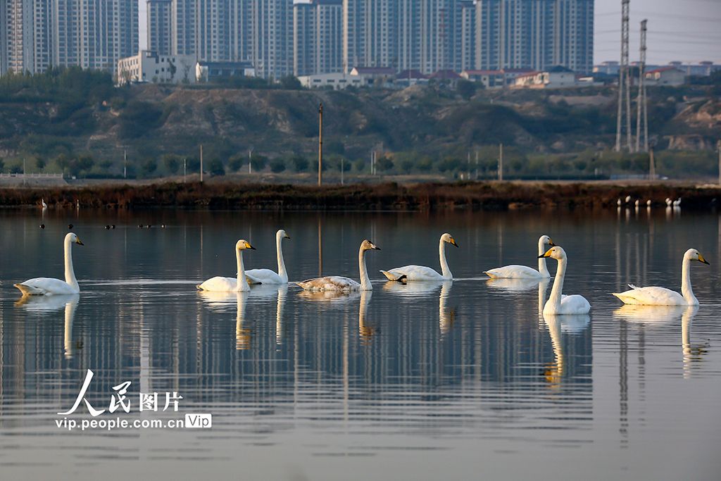 2025年10月27日,山西省运城市盐湖湿地景区迎来了首批越冬的天鹅,它们在水面上悠然嬉戏、展翅飞翔,为盐湖增添了一道灵动的风景线。姜桦摄(人民图片网)