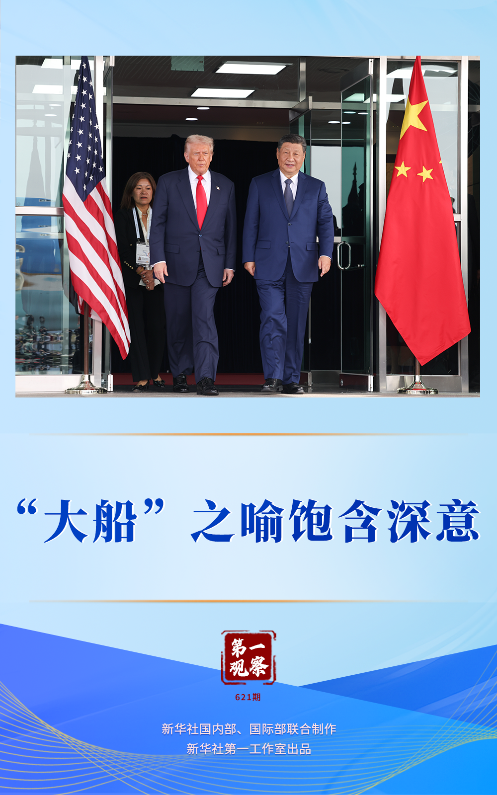 当地时间10月30日上午,国家主席习近平在韩国釜山同美国总统特朗普举行会晤。习近平主席深刻指出:“面对风浪和挑战,我和特朗普总统作为掌舵人,应当把握好方向、驾驭住大局,让中美关系这艘大船平稳前行。”