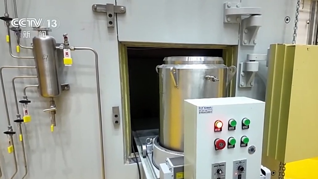 总台央视记者 帅俊全:钍基熔盐堆的核燃料究竟长什么样?现在我手里拿的就是它的燃料盐,常温下可以看到是绿色的盐块。它其实是由白色的氟化钍加上绿色的氟化铀和基盐混合而成。听起来感觉很简单,但其实它是我们的科研团队在十年的时间经过上千次的调配才把工艺参数最终确定下来,使燃料盐能够在西部戈壁上真正去点燃钍基熔盐堆。
