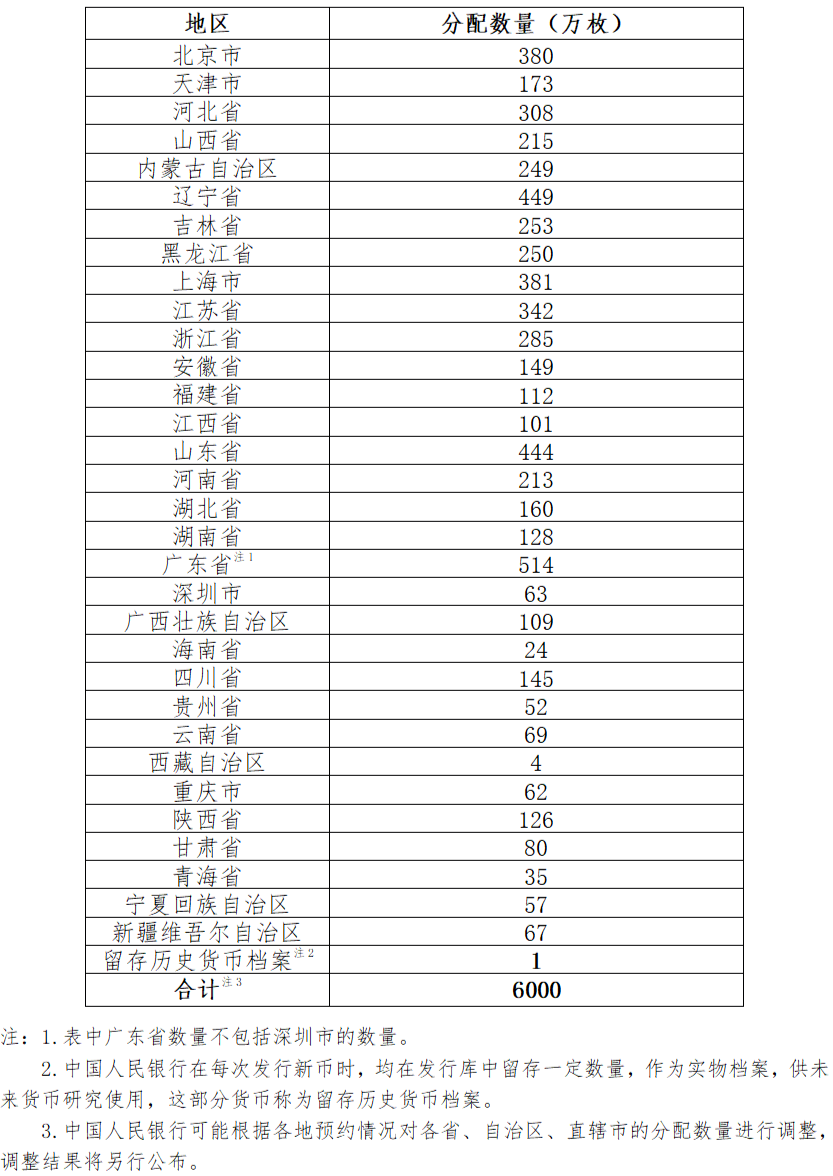 中国京剧艺术普通纪念币面额为5元,直径为30毫米,材质为黄铜合金,发行数量为6000万枚。各省、自治区、直辖市分配数量如下: