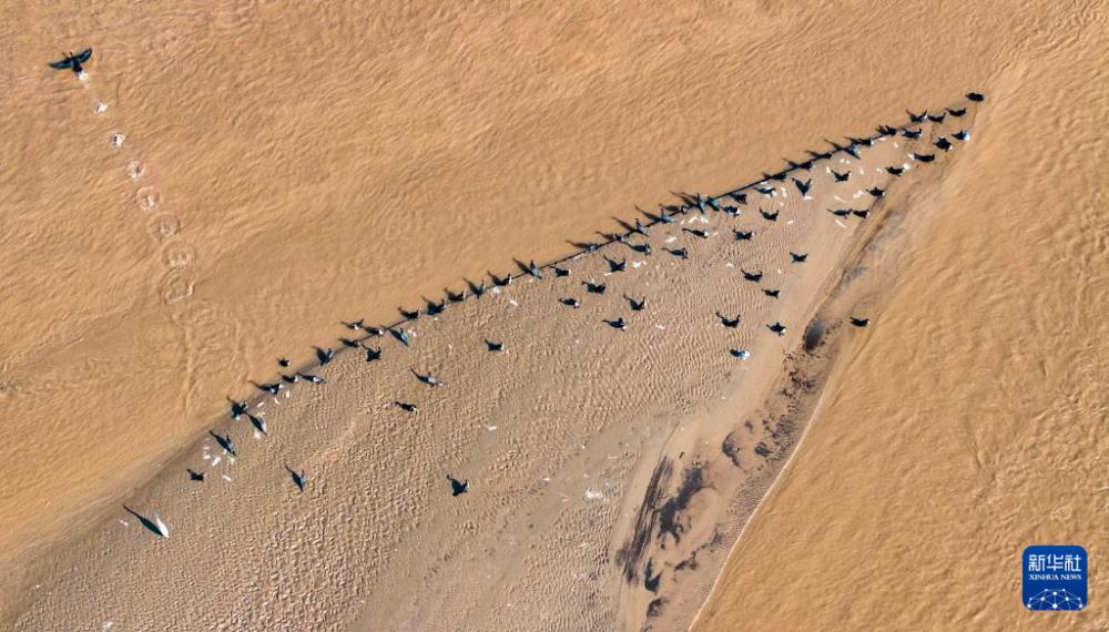 11月4日,在位于宁夏灵武市境内的黄河,候鸟在河滩上驻足栖息(无人机照片)。