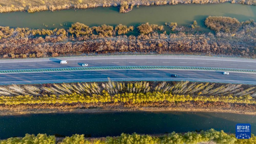 这是11月3日在宁夏银川市贺兰县拍摄的黄河滨河湿地(无人机照片)。
