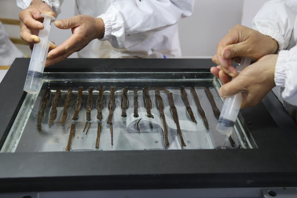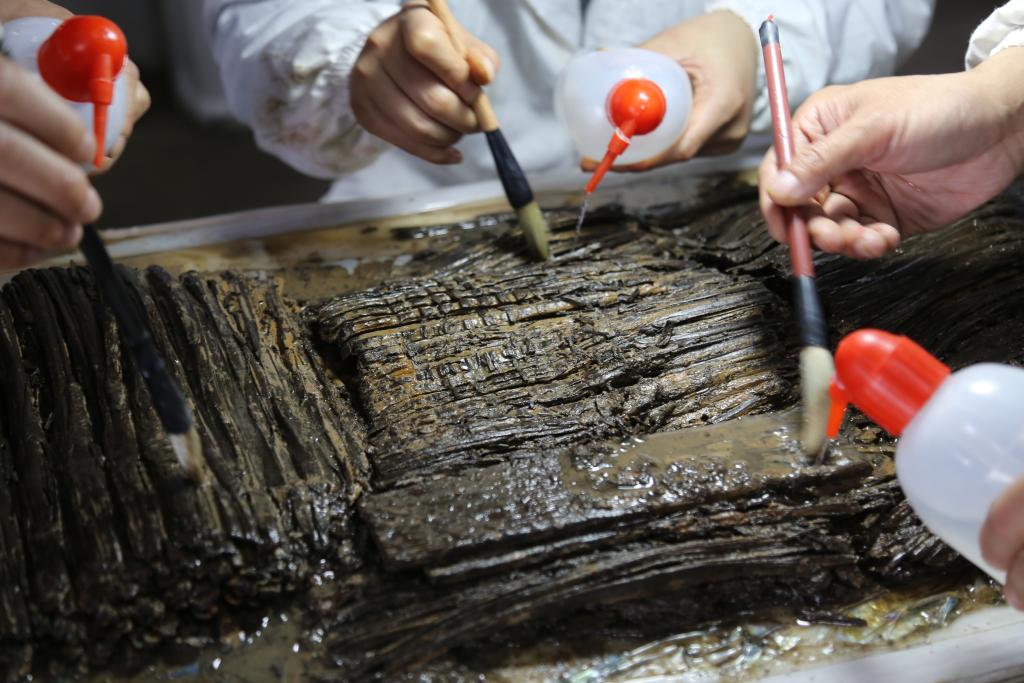 图为文保人员正在进行竹简保护工作。(江西省文物考古研究院供图)