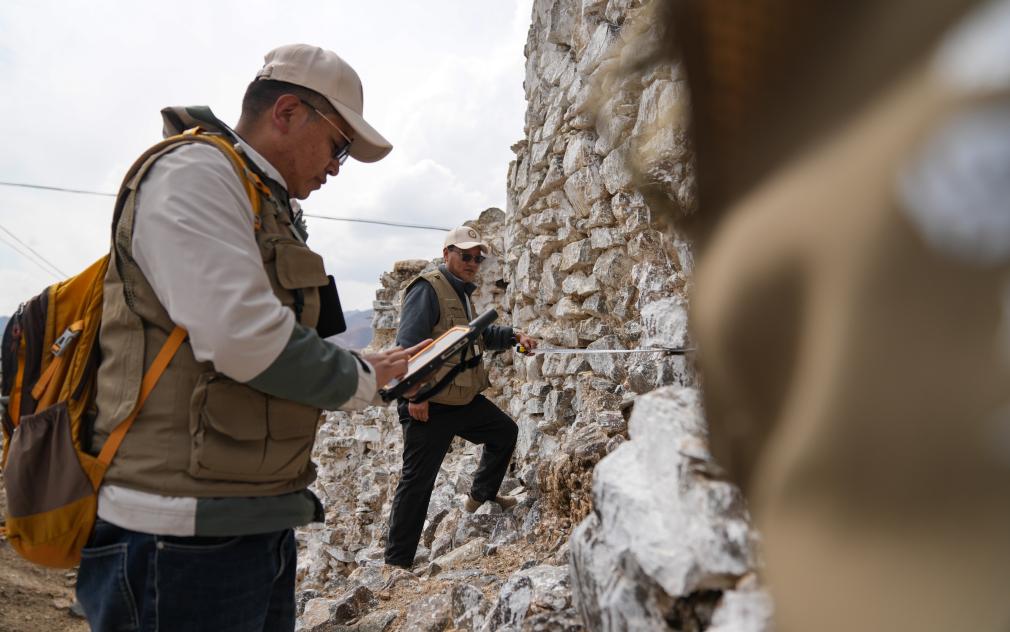 普查队员在西藏墨竹工卡县曲果岗塔群遗址现场开展数据采集。(2024年4月11日 摄) 新华社记者 晋美多吉 摄
