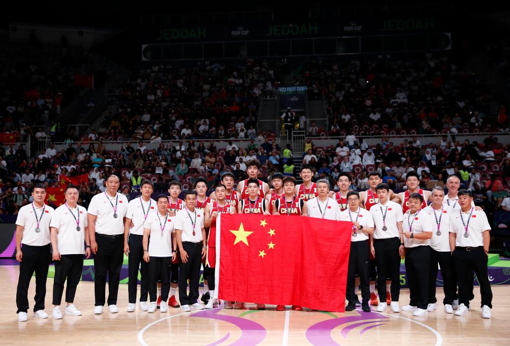 8月17日,在2025国际篮联亚洲杯决赛中,中国队获得亚军。图为中国队在颁奖仪式后合影。新华社记者 王东震 摄