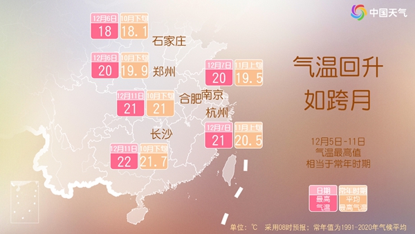中国天气网讯 眼下,全国大部持续升温,本周末(12月6日至7日)气温将从北到南陆续升至近期高点,石家庄、郑州、南京、杭州等地将体验当地10月下旬或11月上旬才有的暖意。不过,下周有两股冷空气先后来袭,各地又将迎来明显降温,建议公众关注气温变化,及时添衣保暖。
