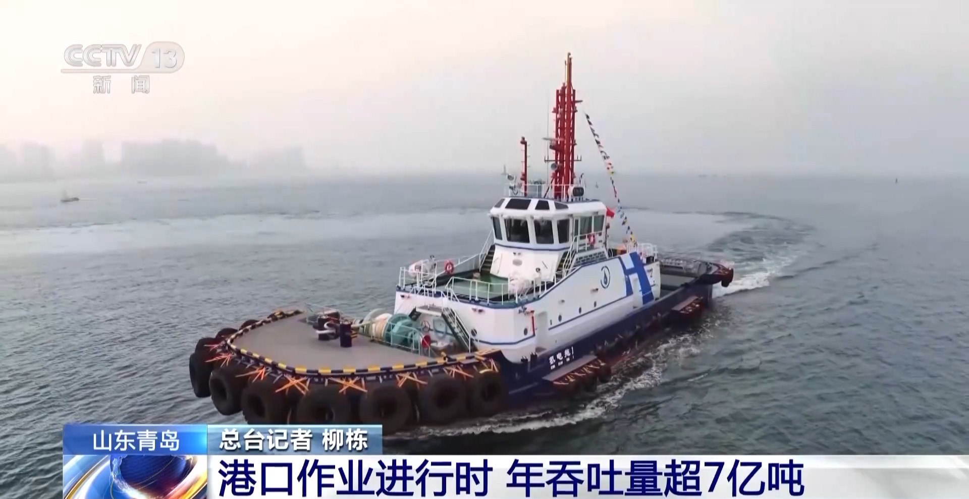 在山东青岛港集装箱码头的作业现场,记者在一艘船的甲板上,这艘船是今年6月刚投入使用的全国首艘氢电拖轮。记者从青岛港了解到,今年港口的货物吞吐量突破了7亿吨大关,其中集装箱的吞吐量也突破了三千万标准箱。这些数据的背后离不开港口工作者的辛勤付出,也离不开新能源、新技术的加持。