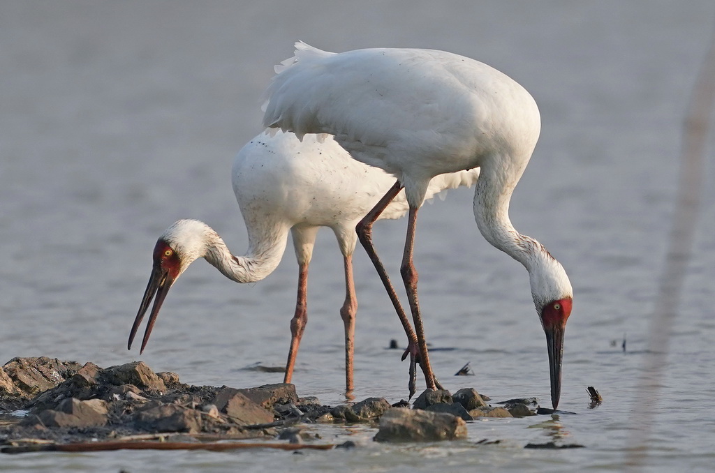 两只白鹤在南昌五星白鹤保护小区内栖息觅食(12月17日摄)。