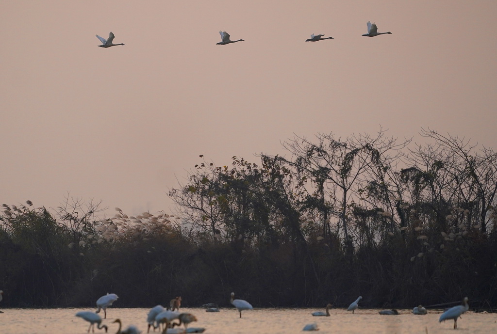 冬日时节,鄱阳湖畔的南昌五星白鹤保护小区迎来候鸟栖息高峰。白鹤、天鹅、白琵鹭等候鸟在湿地中成群翔集,觅食嬉戏,享受冬日暖阳。新华社记者 万象 摄