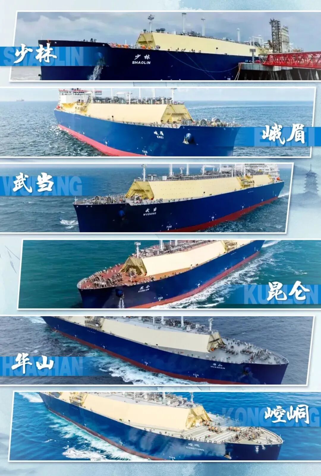 先看这组“武林风”满满的名字——“少林”“武当”“昆仑”“峨眉”“华山”“崆峒”。是不是瞬间脑补出各大门派高手齐聚的画面?这些在武侠世界里响当当的门派,如今成了LNG船的名号,仿佛给这些海上巨轮赋予了“独门绝技”,驰骋大洋守护能源安全,妥妥的“海上武林天团”既视感。