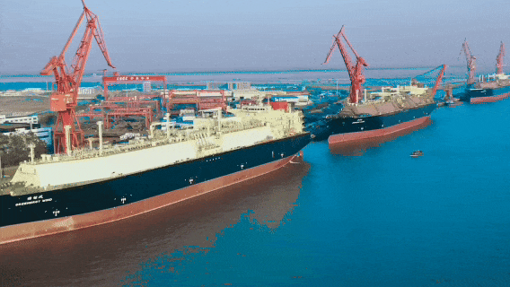 在长江入海口,长兴岛码头,眼前是在建的数艘LNG船,宛如一座座海上城堡。