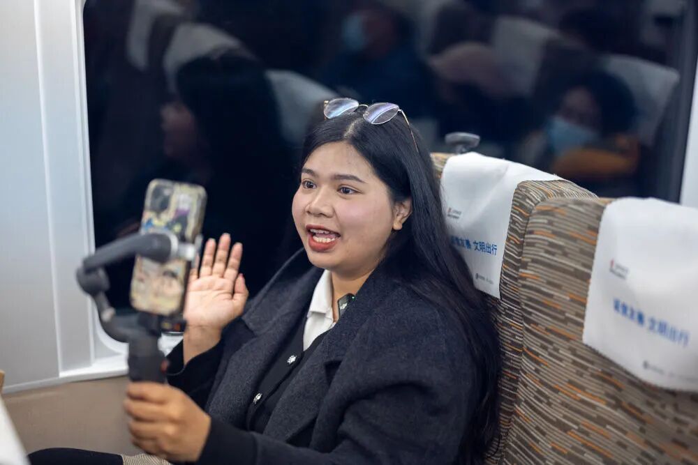 2025年2月21日,泰国博主李佩英在中国拍摄体验复兴号高铁列车。新华社记者 黄伟 摄