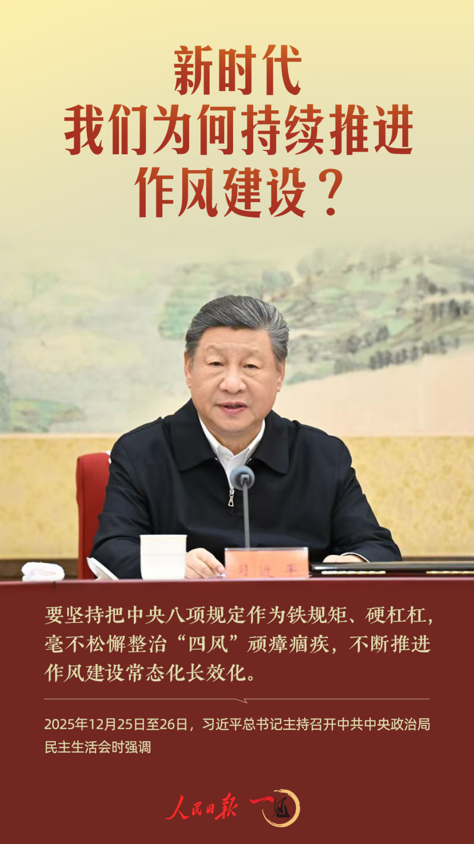 12月25日至26日,中共中央政治局召开民主生活会,强调“要坚持把中央八项规定作为铁规矩、硬杠杠,毫不松懈整治‘四风’顽瘴痼疾,不断推进作风建设常态化长效化。”