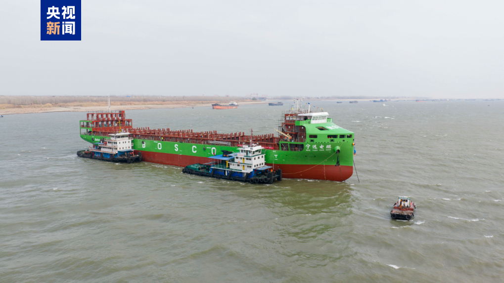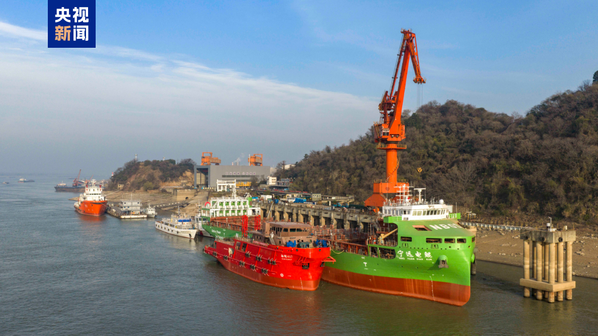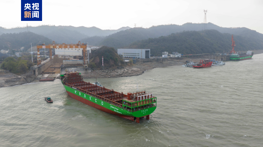 12月31日上午,在江西九江,740TEU纯电动敞口集装箱船宁远电鹏号在湖口下水,这意味着两艘国内首制率先下水的万吨级纯电动智能海船建成。