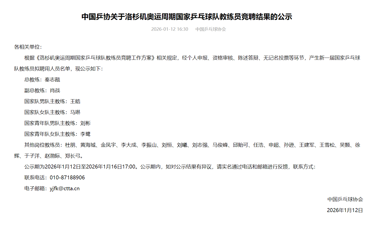 央视网消息:据中国乒协官网消息,中国乒协12日公示洛杉矶奥运周期国家乒乓球队教练员竞聘结果,拟聘秦志戬为总教练、肖战为副总教练、王皓为男队主教练、马琳为女队主教练。