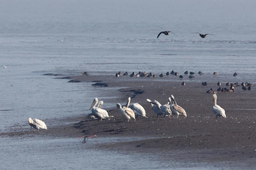 2025年1月22日,在上海崇明东滩鸟类国家级自然保护区拍摄的国家一级保护动物卷羽鹈鹕。(冯雪松 摄)