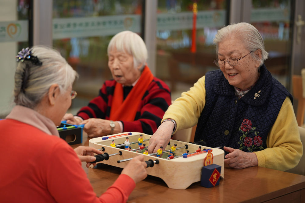 2月10日,社区内老年人玩益智游戏。