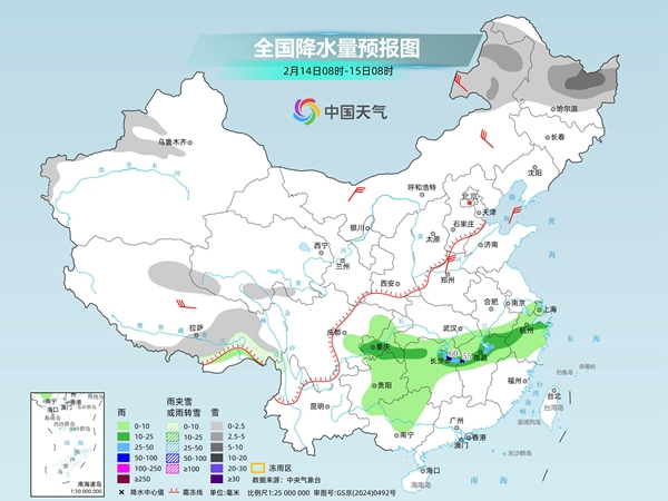 明天,内蒙古东部、黑龙江北部、新疆沿天山地区和伊犁河谷、川西高原南部等地部分地区有小雪或雨夹雪,其中,内蒙古东北部等地部分地区有中到大雪;江南中北部和南部、西南地区东南部、广西中西部等地部分地区有小到中雨,其中,湖南西部、贵州中部等地部分地区有大雨。