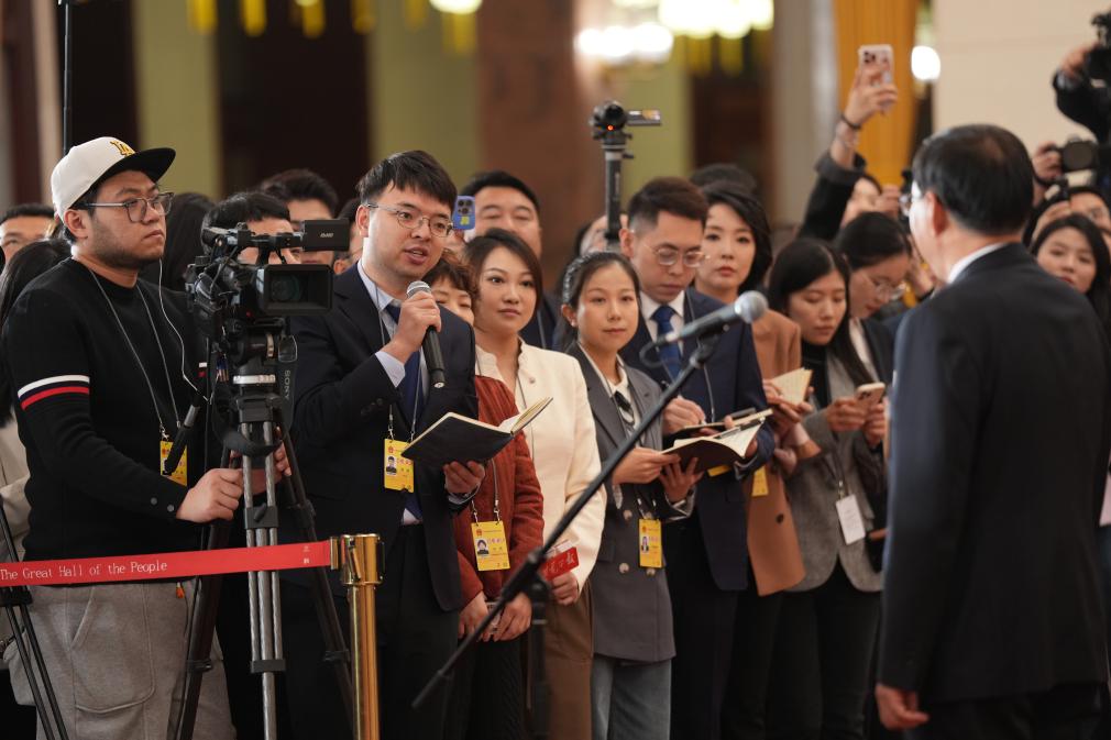 3月5日,第十四届全国人民代表大会第四次会议首场“部长通道”集中采访活动在北京人民大会堂举行。这是记者在现场提问。