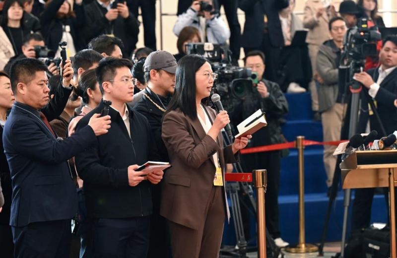 3月9日,第十四届全国人民代表大会第四次会议第二场“部长通道”集中采访活动在北京人民大会堂举行。这是记者在现场提问。