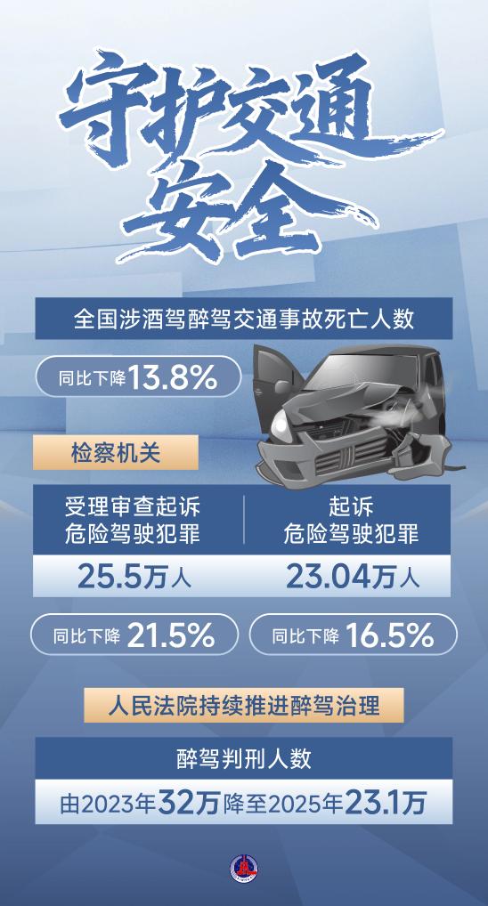 最高法报告指出,办理醉驾刑事案件意见出台后,判刑人数由2023年32万降至2025年23.1万,因酒驾造成交通事故及致死、致伤数量均有下降。同时,明确“驾驶人醉酒后启用辅助驾驶功能仍应承担刑事责任”。